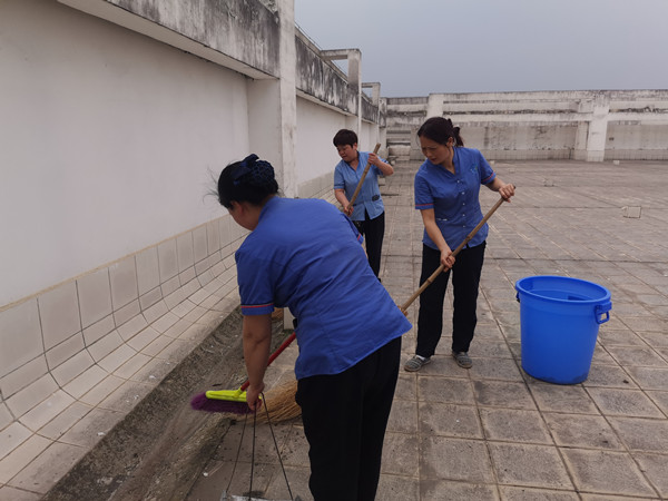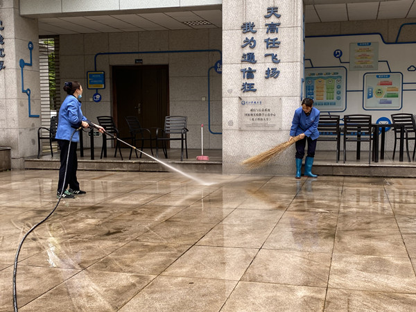 一二号科研楼师生休息放松的平台区内,全体保洁员齐齐参与,拉水管、冲地面、刷沟缝、扫积水、清地漏,尽最大努力恢复地砖的原貌。品学楼的台阶上,物业人员借来高压洗地机,女员工搬水、男同志操作,经过长达五个半小时的不懈努力,终于将品学楼楼外梯步全面冲洗干净。各楼宇的天台上,蓝衣卫士们又忙着除杂草、清淤泥、全面排查疏通排水渠及阀门,力求降低积水风险,同时还开展了防洪沙袋的检查及点位梳理工作,确认外观是否完好,数量是否齐备。